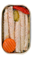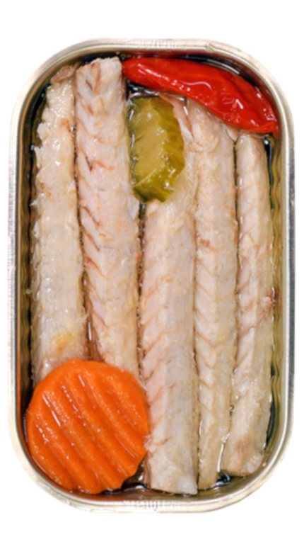 Filetes de Cavala "Minerva" de grande qualidade e sabor. Limpo por mãos experientes e regalado por Azeite, é também adicionada uma malagueta fresca e pickles de cenoura e pepino.