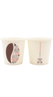 Os copos apresentam diferentes designs relacionados com a cultura do café.